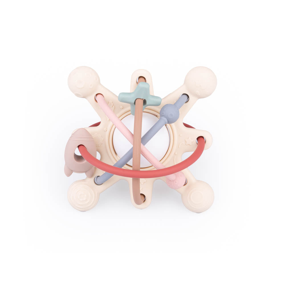 A uniquely designed 3D sensory teether that combines soothing relief with developmental play. The Cosmo's multi-textured chewable arms and pullable rings engage babies' senses while the rattle feature keeps them entertained. A proven seller in European markets, now available exclusively in North America through Rattle and Roll Toy Company.